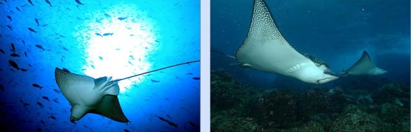 6) DARWIN AND WOLF - אמנם הם בסוף... אבל שני האתרי צלילה האלה נחשבים לאתרים הטובים בעולם כדי לראות whale shark שזה סוג של לוויתן, ובכלל כל הכרישים שאתם רק חולמים לראות פשוט שוחים שם לידכם כמו זבל בלהקות ענקיות... אני לא מדבר על דולפינים ששם זה המקום היחיד שראיתי דולפינים בכל הצלילות שלי. אבל יש בעיה קטנה: שני האיים האלה מרוחקים (יחסית) משאר האיים ונמצאים בקצה הצפון מערבי של הגלאפגוס ואף סוכנות לא מוציאה לשם צלילות כי זה לילה שלם של הפלגה לשם... האופציה היחידה להגיע לשם היא בקרוז צלילות (ספארי צלילות) כמו שלקחתי, שיש אולי 4 ספינות בלבד שעושות קרוז כזה והם יקרות מאוד, הרבה מעבר לכיס שלנו... מדובר על 3700$ בשביל 8 ימים שמתוכם צוללים כל יום בין 2-5 צלילות. מי שבכל זאת מתעניין בספארי צלילות שני אוניות מומלצות הן: "agressor" ו- "sky dancer".
