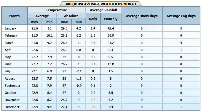 מזג האוויר בארקיפה דומה למזג האוויר בשאר ערי האנדים (כמו קוסקו), העונה היבשה היא העונה המומלצת לטייל שם והיא מלאה בתיירים במאי עד ספטמבר אבל אפשר להגיע אליה בכל השנה. בחודשים יולי ואוגוסט העיר מלאה וקשה יותר למצוא מקומות לינה ולכן רצוי להגיע לפני או אחרי ואז גם מזג האוויר נוח יותר ונעים יותר.