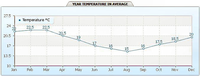 להלן טבלת טמפרטורה ממוצעת לחודשי השנה, טמפרטורה ממוצעת ביום ובלילה, טמפרטורה מקסימלית ומינימלית שנמדדו בשנים האחרונות, מספר ימי הגשם, שלג וערפל ממוצעים. בטבלה השניה נוכל לראות את גרף הטמפרטורה הממוצעת לפי חודשים.