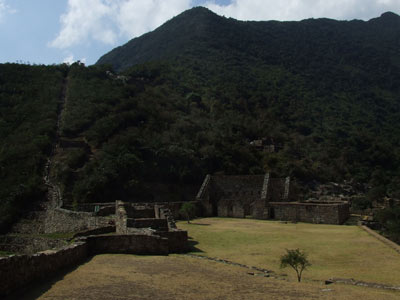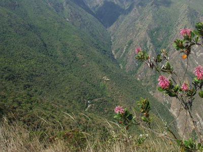 היום כדאי להשכים מוקדם –עוד בשעות החשיכה כי יש לנו טיפוס של 1500מ’ משפת הנחל עד לעיר צ’וקקיראו. אנו חוצים את הגשר (Puente) מעל הנחל ומטפסים מעלה. מהמבנה הראשון (בדרכנו לחניון אתמול) בחניון (גגות ירוקים) יש שביל שמושך ימינה למטה לנחל. אנו נחצה אותו ונטפס כשNevado Corihuaynachina המושלג סוגר עלינו מלמעלה (הפסגה הימנית 5405∙ והשמאלית 5635∙). נחצה את הכפרים Santa Rosa וגם Maranpata והנוף במהלך היום יישתנה: יותר ויותר שיחים וסבך, ולאחר מרנפטה גם יערות-עננים כמו נוף המצ’ו פיצ’ו (יער סבוך), מיני שרכים ושבטבטים, סחלבים ועצים. נחצה את נחל הChunchumayo שזורם דרומה לנהר אפורימק (נק’ מילוי מים), ומיד אח"כ הגענו למנוחה בעיר עצמה (טראסות חקלאיות). הכיפה הגבוהה הלא מושלגת מעל העיר בגובה 3957+. אם לא עוברים בחניון הלילה שלמרגלות האתר אז לא משלמים כניסה (המחיר:36 סול או 18 סול הנחה לסטודנטים), כשחוזרים לחניון הזה לחניית לילה אז צריך לשלם את המחיר הנ"ל.