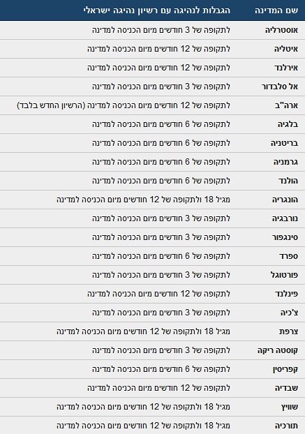 ישנן מדינות המתירות נהיגת רכב פרטי ברשיון נהיגה ישראלי בר-תוקף (מבלי לצרף רשיון נהיגה בינלאומי) בהגבלות מסוימות. יודגש כי במדינות אלו גופים שונים כגון: חברות השכרת רכב, רשויות אכיפה, עדיין אינם מודעים להכרה של מדינותיהם ברשיון הישראלי. ולכן בכל מקרה מומלץ לקחת אתכם רשיון נהיגה בינלאומי.